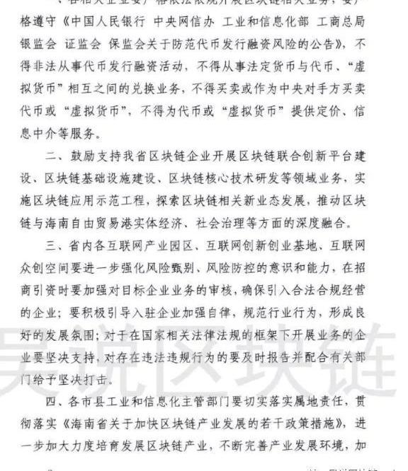 吴说区块链获悉,继5月9日海南出台《关于印发海南省加快区块链产业发展若干政策措施的通知》后,5月15日海南工信厅紧急再次发文,题为《海南省工业与信息化厅关于严格依法开展区块链相关业务的通知》,“进一步退一步”,打消了许多币圈人士的“幻想”。吴说区块链获取的这份通知指出,各相关企业要严格依法依规开展区块链相关业务,要严格遵守《中国人民银行中央网信办工业和信息化部工商总局银监会证监会保监会关于防范代币发行融资风险的公告》,不得非法从事代币发行融资活动,不得从事法定货币与代币、“虚拟货币”相互之间的兑换业务,不得买卖或作为中央对手方买卖代币或“虚拟货币”,不得为代币或“虚拟货币”提供定价、信息中介等服务。其中不得买卖或作为中央对手方买卖代币或“虚拟货币”,不得为代币或“虚拟货币”提供定价、信息中介等服务,这两个提法非常新。前者或指一些tob的做市商、服务商,后者或指目前的一些媒体、平台机构。目前无法判断这一新提法来自北京还是海南自身研究所得,但前者可能性似乎更大。此外,通知要求省内各互联网产业园区、互联网创新创业基地、互联网众创空间要进一步强化风险甄别、风险防控的意识和能力,在招商引资时要加强对目标企业业务的审核,确保引入合法合规经营的企业;要积极引导入驻企业加强自律,规范行业行为,形成良好的发展氛围;对于在国家相关法律法规的框架下开展业务的企业要坚决支持,对存在违法违规行为的要及时报告并配合有关部门给予坚决打击。此前《关于印发海南省加快区块链产业发展若干政策措施的通知》中,指出支持龙头企业探索数字资产化交易平台建设,探索数字化、数字资产确权保护、数字资产全球化流动、数字资产交易方面的标准和技术模式,推动数字资产相关业务在海南先行先试”,“探索“区块链+金融沙箱监管机制。金融企业通过审批,可在沙箱内开展区块链创新型产品、服务、商业模式和传送机制测试。”15日的文件紧急发出,可以看出海南相关部门或许受到了一定压力,也打消了币圈人士的幻想。事实上,中国的金融管制向来是相对保守的,如果中央层面没有明确规划,地方先行先试的可能性并不大。除了交易平台、发币等方面合规化没有任何合规化进展之外,最大的问题还在于是“虚拟货币”的边界不够清晰。例如,基于区块链、可自由交易的积分算不算虚拟货币;数字资产证券化的通证算不算虚拟货币;这两者也是海南此前文件中希望推动的事项,如果态度过于保守那么这两项推进的可能性也不大。吴说区块链认为,加密货币合规化管理监管是国际大势所趋,监管层也有必要更新观念,切实推进,而不是一棍子打死。如18日《人民日报》评论文章所言:如何在打击违法犯罪维护金融安全、保护消费者权益与包容适当技术创新和金融创新之间达成动态平衡,还需要各国立法者和监管者审慎决策。