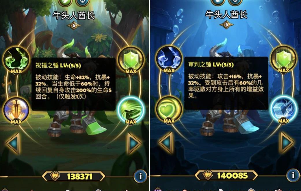 黄金剑士评分:PVE9/10PVP9/10这应该是版本最肉的坦克,春哥被动完爆前面各种减伤回血,经常后排都倒了一两个但是他还活着。一技能减护甲是十分优秀的功能性技能,但打树妖boss时容易给对面回血。是一个万金油坦克。牛头人评分:PVE8/10PVP8.5/10正式版新增加的卡。水系牛头的被动可以驱散对面的buff,但如果对面没有buff技能则相当于本方少了个技能。水系牛头人有全游戏最高的单卡血量,做主坦自然不在话下。