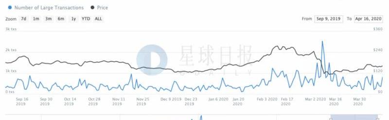 4.数据:ETH大额交易飙升,机构投资者或进一步介入市场区块链分析公司IntoTheBlock的数据显示,在过去几天里,以太坊的大额交易增长了120%以上。大额交易指价值超过10万美元的交易,该类型交易从4月15日的360笔上升到次日的819笔。与此同时,灰度Q1报告发布,ETH价格从150美元飙升至175美元。注:以太坊信托基金一季度资金流入1.1亿美元,超过了过去两年的全部资本流入。ETH在2020年的大额交易有显著的增长,2019年大部分时间的平均交易数量大约为180到290笔。这一数字的上升可能是机构投资者进一步介入市场的结果,这对以太坊的基本面增长是一个积极的信号。