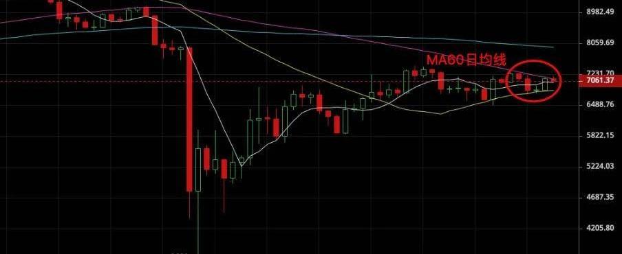 日线级别,随着行情的波动,60日均线也越来越底,目前在7100-7200美金区间。短时来说,即使突破了,如果没有大量能和大阳线配合,也只是代表短线行情的略微好转,并不能说明反弹行情来了,也不是行情反转的信号。