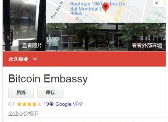 图片源自:谷歌可惜的是,其他地区的比特币大本营在陆续开放,但蒙特利尔的首个大使馆现如今已永久停业,其Facebook的更新帖还停留在2018年11月1日。往期回顾:比特币在太空?Blockstream租用的卫星成功传播首笔BTC交易下期预告:史上最早禁止也是最早解禁比特币的国家比特币你不知道的故事系列合集,将持续更新,敬请期待......