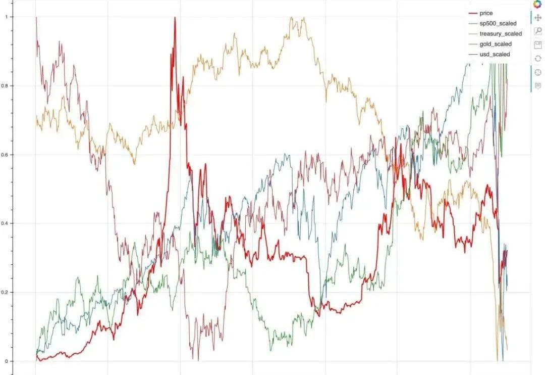 冠状大流行前的分析数据准备:按比例绘制的价格图在开始分析之前,让大家注意一下这5种资产的价格图表:比特币、标准普尔500、美元、黄金和美国国债。从2017年1月到2020年3月,你可以看到五种资产价格。