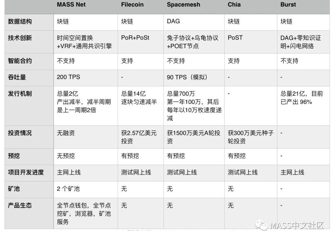 编者按:本文来自MASS中文社区,星球日报经授权发布。PoC(Proof-of-Capacity)容量证明机制,是一种通过存储容量投入来争夺记账权和交易费用的共识达成机制。早先容量证明被称为PoS(Proof-of-Space)——空间证明,由于权益证明的缩写也是PoS,出于避免歧义的考虑,普遍接受了PoC(Proof-of-Capacity)的说法,有一些项目采用PoSt(Proof-of-Space-time)这一说法,但核心本质依然是容量证明。PoC挖矿主要有两个特点,一是更加去中心化,硬盘分布远比芯片(PoW)和资本(PoS)的分布要更加普遍,更加平均。二是节能,硬盘挖矿能耗低,硬盘资源可重复利用。这两个特点使得PoC挖矿门槛低,人人都能参与。2014年,一篇名为《EfficientHDDMining》的帖子在BitcoinTalk中发出,介绍了POC容量证明的理念,并公布了源码,这篇帖子的发布人就是BurstCoin的创始人,而BurstCoin就是历史上第一个成功的PoC公链。6年的时间过去了,容量证明的理念在加密圈生根发芽,一些项目传承了BurstCoin核心理念和挖矿算法,还有一些项目在安全性、公平性、扩展性上进行了技术探索。由于顶级明星项目Filecoin融入了容量挖矿的概念,更是给PoC共识带来了关注。2020年,PoC项目已经或即将陆续落地,这篇文章我们会把MASSNet和Filecoin、Spacemesh、chia、Burst这4个项目做一个对比。通过对比,进一步理解MASS以及PoC领域整体情况。如果想深入了解MASS,推荐阅读白皮书和往期推送文章。MASSNet