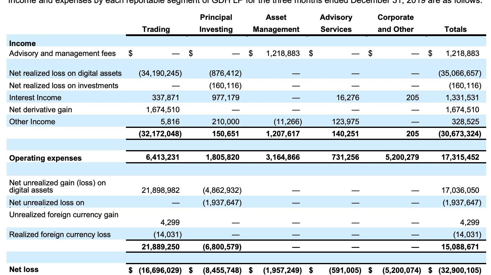 尽管当时的GalaxyDigital还是一家创业公司,但日本上市公司GalaxyDigitalHoldingsLtd持有其部分股权,因此也需要公布详细财务数据。对于2018年三季度的亏损,GalaxyDigital表示,这主要是由于投资以太币、比特币和瑞波币所致。GalaxyDigital的巨额亏损与其创始人盲目乐光有着直接关系。作为加密货币投资的直接参与者,2017年年底GalaxyDigital创始人Novogratz曾预言,比特币价格会飙升至高达4万美元。不过在此后的一波又一波大跌之后,比特币价格最终下跌至3600美元附近,距离他预言越来越远。时间来到2020年,根据GalaxyDigital最新一期财报显示,GalaxyDigital在2019年第四季度净亏损3290万美元。消息披露之际,该公司股价正处于2019年6月份高点之后的持续下跌通道。Novogratz在财报电话会议上表示:“我认为“黑色星期四”不会让我关于比特币的观点失效。”他后来补充道,“我真的很有信心,到今年年底,比特币将会上涨。”尽管Novogratz对整个比特币市场充满信心,但银河数字在2019年最后一个季度遇到的麻烦依然不小。其交易部门的净实现亏损超过3200万美元,其中总净亏损约为1670万美元,其主要投资部门也净亏损840万美元。所披露的财务数据截至2019年12月30日,因此不包括2020年的绩效详细信息。如果的算上2020年3月份在“黑色星期四”中的亏损,银河数字的损失恐怕会有更多。