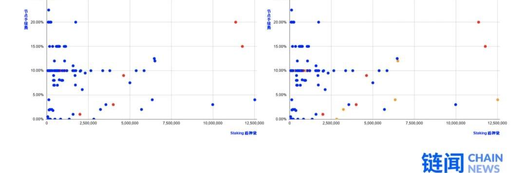为了进一步验证Staking资本的行为模式具有一定的规律性,根据Cosmos手续费率和质押量这两个变量,我们将资本方运营的节点数据在所有节点服务商数据之下进行标记,并将另一个有代表性的节点进行比较,作出如下点状图。我们将资本方运营节点标记为红色,矿池及交易所运营节点标记为金色。