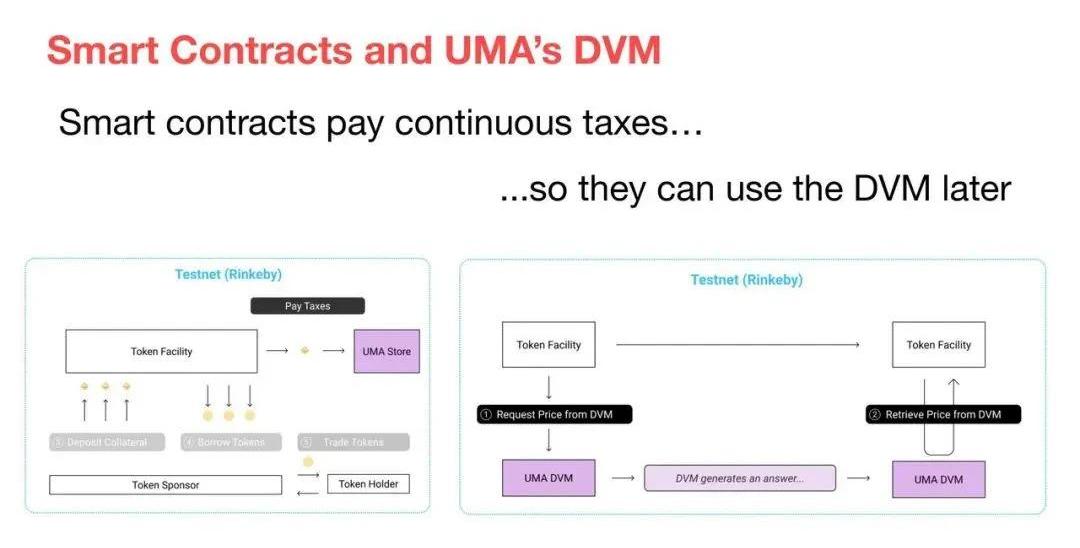 文章的最后一部分介绍了UMA在合约架构上的创见:DeFi应用需要频繁地更新价格,那么如何既能保证信息输入机制的安全性,又能节约对信息输入机制的使用呢?似乎必须为合约的价格信息使用设置延迟,只不过是看这个延迟是设计在哪个层面。但是,如果token铸造出来是用来交易的,那么创造合约的人和持有token的人是不同的人群,后者可以观察到合约的担保品数量够不够,并向UMADVM发出审核要求。这就用来自对手方的压力迫使创造合约的人保证担保品的充足,免去了安排链上喂价机制的需要。