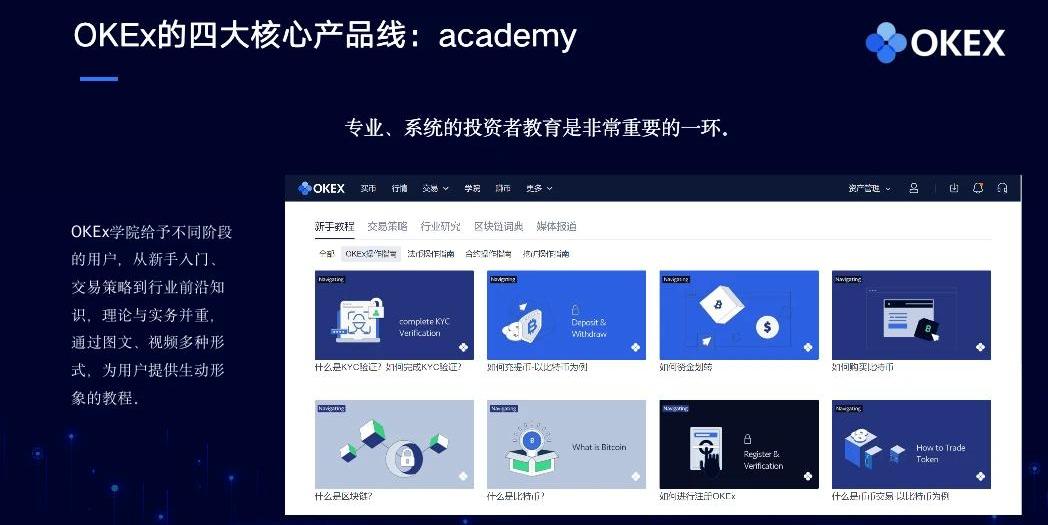 第四大核心产品线就是「学院」,通俗理解就是投资者教育。我们认为不管是对于整个加密货币行业而言,还是对于OKEx而言,投资者教育都是非常重要的,我们今年也投入了很大的精力在OKEx学院上。我们对学院做了分类,我们不仅有专门针对小白用户设计的新手教程,也设计了针对老用户的交易策略,OKEx上有很多大户,他们也会为我们贡献很多宝贵的交易经验和交易策略。