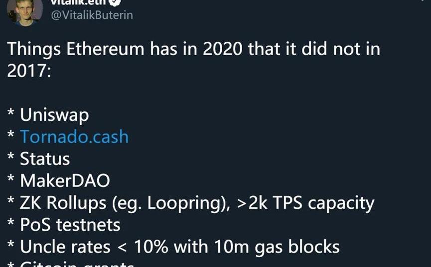 编者按:本文来自白话区块链,作者:一棵杨树,Odaily星球日报经授权转载。3月27日,V神在社交平台发文“因为有这些事物存在,使得2020年的以太坊,不再是2017年的以太坊”,列举例证中包含了以MarkDAO为代表的DeFi赛道,而在其中,Uniswap、Loopring作为DEX不同类型的标杆被提及。