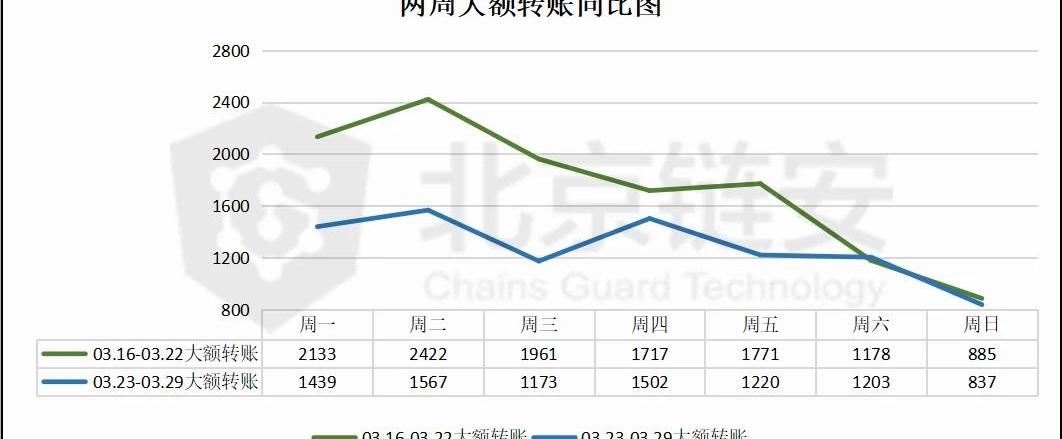 大额转账数:03.16-03.22:1206703.23-03.29:8941较之前一周下降:25.91%详细数据图如下: