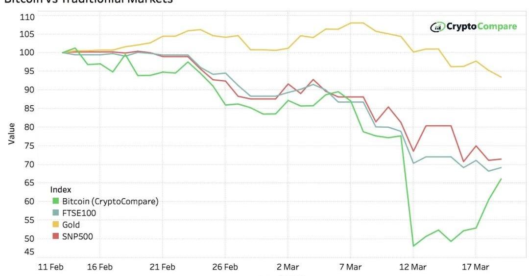 当前的金融危机再次反应出比特币在2008年诞生的面临的问题。2008年,各国政府利用各种的金融工具以降低金融危机的冲击,然而收效甚微。同时这也让让中本聪(SatoshiNakomoto)萌发了创建一个永远不会被稀释的资产类别。2020年,历史再次重演。而此次由疫情在全球扩散而引发的全球经济危机,来得更为迅猛。但与所有金融危机时期一样,现金是王道,但事实可能证明,这是短暂的。我们看到所有市场的风险都在下降。数字资产市场也未能幸免于资金外逃,3月12日,随着标准普尔和富时指数大跌,数字资产市场出现了大幅下跌。标准普尔500指数上个月下跌了29%富时100指数上个月下跌了31%上个月金价下跌了8%比特币上个月下跌了30%然而,比特币仍在建立自己的资产类别。随着这场危机的展开,我们可能开始看到它作为一个相关性较低的价值存储手段的迹象。这张图表显示了过去六周比特币对主要股市和黄金的走势: