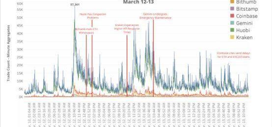 3月12日至13日,加密市场所有交易所和交易资产均经历了近乎前所未有的市场抛售。尽管大多数分析着眼于数字货币价格的暴跌以及这一系列事件对数字货币的含义,但Kaiko团队仅对一个简单的测量指标“交易量”感兴趣。交易量不考虑价格或交易额规模,仅考虑在交易所发生的原始交易数量。因此一笔10BTC的交易和0.01BTC的交易也是可以同等对待的。从基础设施的角度来看该指标非常有趣:哪些交易所可以处理更高的交易数量,而哪些交易所的处理时间更慢?交易所,订单执行平台,区块链和数据提供商都必须在技术上做好准备,以应对大幅增加的交易量。像3月12日至13日这样史无前例的交易量飙升会导致网络拥堵,处理速度变慢并阻碍服务正常运行所需的其他内部流程。在价格暴跌期间,我们调查的几乎每个交易所都遇到了某种形式的基础设施问题。交易所基础设施所遇到的问题