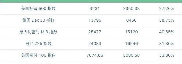 当然,随着各国央行成为政府事实上的分支机构,这一举措将导致政府融资方式的彻底改变,其目的是将债务货币化,直至恶性通胀蔓延。德意志银行(DeutscheBank)全球外汇研究主管乔治?萨拉韦罗斯(GeorgeSaravelos)表示:「政府可能需要直接介入,为数以千计的企业乃至个人提供流动性担保。这可能真的需要直升机撒钱。」今天特朗普承诺给所有美国人送去1000美元只是第一步。我们没法通过这种千篇一律的救市措施思考出美国究竟对于本国金融市场的战术如何。但我们可以从美国的战术思考路径中判断一二。以下仅为个人臆测,并没有严格的数据支撑,仅供参考。根据笔者在美国近十年的经历来说,我认为美国就像他们喜欢的橄榄球比赛一样,是一个从上到下都重战术而轻战略的国家。所以目前美国采取的策略我大胆猜测一下,应该是这样的:首先,美联储大笔降息、印钞,让市场形成一种共识,即:美联储已经认为目前将面临的是一场持久性强,且烈度高的经济危机,因此出于对未来的预期,美国将实施强有力的财政政策。这种共识有着很强的诱导性,当一个国家看空自己的经济时,资产会持续性的恐慌性下跌。作为流通最广泛和占比最重的资产类型,美元资产会开始在全球范围内造成负面影响。但是,此时有一个关键点:即我不需要跑的比狮子快,只要跑得比别人快就好。比起世界各国的股市,美股的跌幅只要小于其他资本市场,那么投资人清偿的意愿可能会大幅减弱。按照下图来看,美国股市的表现要强于各发达经济体。
