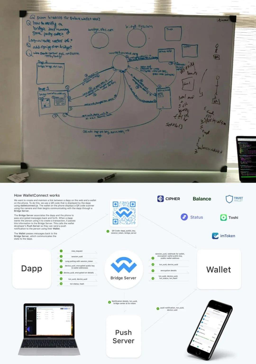 WalletConnect第一版手绘架构图目前WalletConnect的采用率已经很高,一些主流的钱包和DApp都已经集成,包括Trust、Metamask、Argent、GnosisSafe、Infinito、Atomic等17款钱包,以及MakerDAO、Uniswap、BinanceDEX、DDEX、1inch、dYdX等39款DApp。这些钱包和DApp工具覆盖了很多流行且活跃的项目,且以去中心化交易所和去中心化金融为主。割裂的体验:DApp在电脑端,钱包在手机端