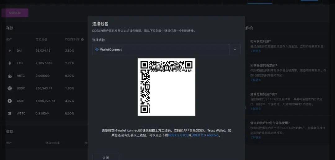 来,让我们和读者一起体验一下WalletConnect的流程。整个流程一般仅需要3至4步即可,我们这里以Argent钱包和DDEX的存款功能为例。1.电脑端:在桌面浏览器中问DDEX.io网站并进入「借贷」模块,然后点击右上角的「连接钱包」按钮,选择WalletConnect,这时候会出现二维码。