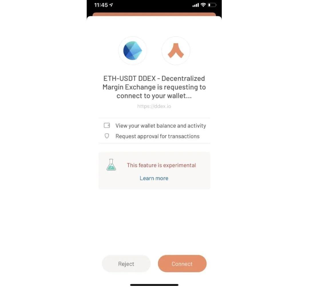 2.手机端:打开Argent,然后选择扫描功能,用摄像头扫描DDEX的二维码,在手机上出现的授权页面中点击「Connect」。这时WalletConnect已经为移动端钱包和电脑端DApp建立起了连接。