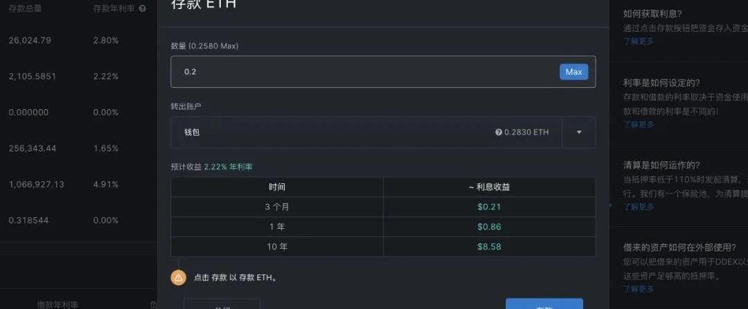 3.电脑端:进入ETH的存款功能。输入存入数量,点击「存款」按钮。