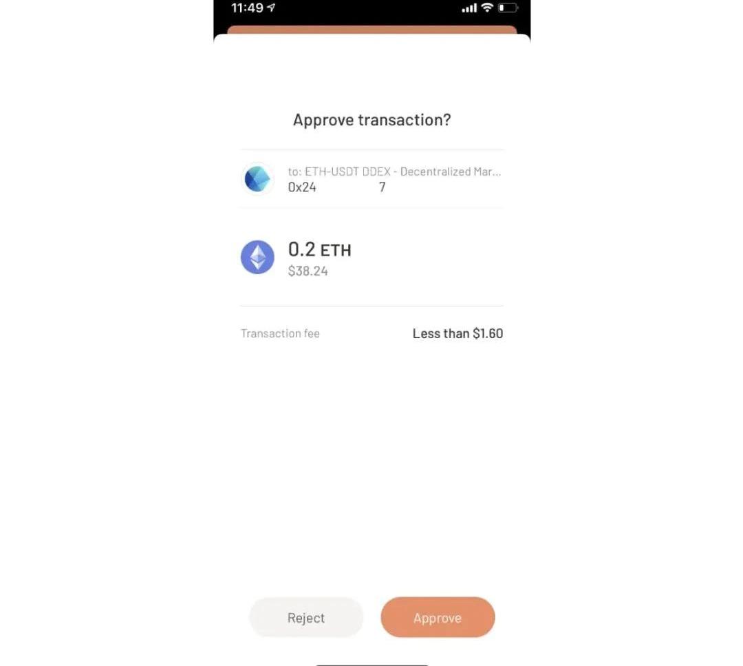 4.手机端:在钱包工具中会弹出授权页面,需要用户的授权才可签署交易。点击「Approve」即可完成交易。