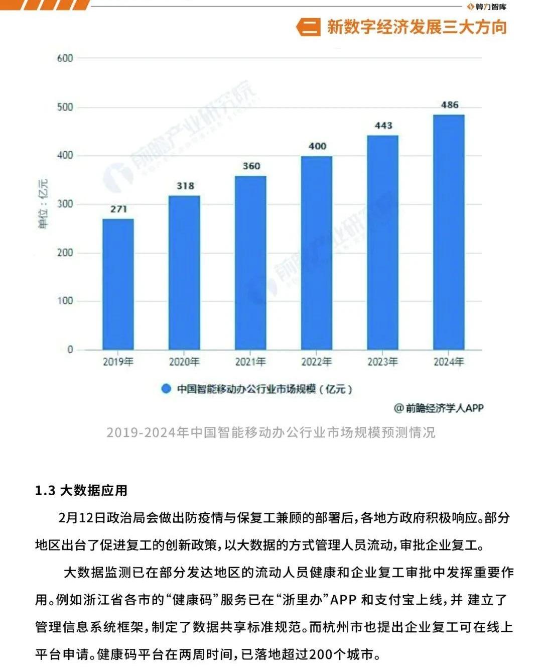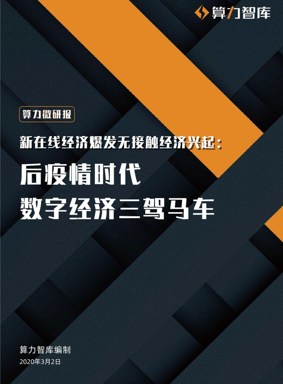 您正在阅读算力智库第2篇微研报系列前言受疫情影响,当传统产业的发展一度陷入缓滞,数字经济却按下快进键。从软件端的云上应用,到科技“硬”实力,数字经济全面助力抗议和复工。今日,算力智库发布《新在线经济爆发、智能制造稳步发展、无接触经济兴起:后疫情时代数字经济三驾马车》。报告复盘了疫情期间崭露头角而意义深远的数字经济代表案例,并预判迈向数字化社会的三大方向——新在线经济、智能制造经济、无接触经济。报告提出三大核心观点:短期内,新在线经济爆发智能制造经济中长期将稳步发展无接触经济兴起报告同时指出,随着复工复产的到来,上述三大方向的发展将面临和疫情期间不同的挑战,并呈现不同频的发展态势。