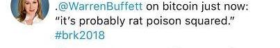 CNBC记者采访巴菲特之后所发的推特2013年,当比特币只有100多美元的时候,巴菲特曾表示比特币是老鼠药。这一次当CNBC记者问及“比特币从100多美元涨到9000多美元,您对此怎么看?”时,巴菲特回答说:“可能是老鼠药的平方了。”而在2019年5月份的伯克希尔·哈撒韦股东大会上,当被记者问及对比特币的看法时,巴菲特对比特币的厌恶情绪再次升级。巴菲特对一群记者说,“这是一个的东西,有很多欺诈与之有关。比特币没有产生任何价值。”他补充称,“它什么也做不了。它就在那里。这就像贝壳之类的东西,对我来说不是投资。”但巴菲特却对区块链表示了较为友好的观点,当被问及巴菲特是否会投资区块链时,他表示,“我们可能会间接参与,但我不会是区块链的主要领导者。”与此同时,巴菲特的黄金搭档,伯克希尔副董事长查理·芒格也持有同样的看空比特币的观点。同样是在2019年5月份的股东大会上,查理·芒格表示,他曾受邀参加加密资产投资活动,但是自己拒绝了,因为在他看来,这些活动只是比特币粉丝在进行庆祝加略人犹大式的狂欢。芒格之前曾谴责加密资产类别的交易,称参与这些活动是得了痴呆症。并认为那些从事加密货币交易的专业交易员,令人作呕。而在2020年2月12日,在美国出版商DailyJournalCorp的年会上,查理·芒格重申了自己对比特币的看法:“我痛恨比特币那样的事物。痛恨那些本质上反社会的东西。”并称比特币的“信徒”们聚在一起是“欢庆犹大那样的生活和工作。”针对巴菲特曾经严苛的批评声,比特币的支持者们坐不住了,2018年5月份,就在巴菲特再次放出“比特币耗子药”论调时,比特币云挖矿公司GenesisMining在巴菲特办公室外竖起了一块巨大的广告牌,上面写道:你说过自己曾错判了谷歌和亚马逊,或许你也会错判比特币。据悉,GenesisMining经常通过类似举动去平衡主流媒体对比特币的负面报道,并试图提高公众对比特币的认知。
