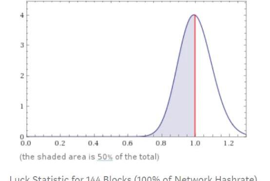 如果我们将区块数量增加到144,也就是100%的每日网络奖励,那么我们就会看到一条正常的曲线,其中包含了相当小范围的潜在结果。在144个区块中,“运气统计”数值不太可能低于0.7或高于1.3。