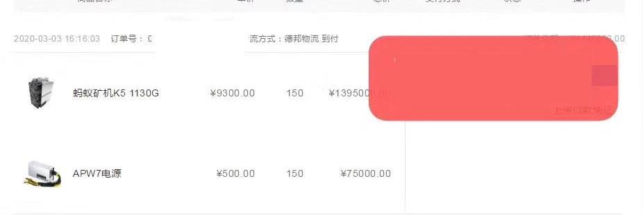 根据哔哔News了解到的信息,市场中存在中间商倒卖矿机的情况。在比特大陆官网已经显示蚂蚁K5售罄的情况下,哔哔News朋友圈中还有不少矿机销售方在卖这款矿机。哔哔News通过询问知情人士了解到,这些销售方确为矿机的“倒卖方”。在被问及这款矿机卖得怎么样时,XX矿业表示“还行”。根据其朋友圈配图,可以发现,150台的打包单中,该款矿机以及电源配件售价9800人民币一套,与官网售价相同。