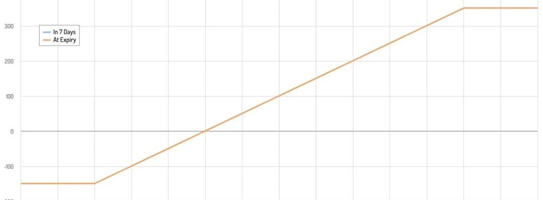 Buy9500Call@117,Sell10000Call@277如果7天后Bitcoin价格≥10000,则获得收益为277-117=160;如果7天后Bitcoin价格≤9500,则损失10000-9500+160=340;如果7天后9500<Bitcoin价格<10000,则获取收益/亏损为10000-Bitcoin价格+141。因为牛市价格趋势向上,卖出熊市价差被行权的可能性较低,而且熊市的下跌多暴跌,相比单纯卖出Put,熊市价差的可能亏损相对有限。合成期货期权的买方为权利方,卖方为义务方,如果同时将权利和义务相对的两个期权的相结合,能够组成为一张到期时间相同的期货合约。假设标的物Bitcoin价格10250,波动率70%,利率2%,剩余时间7天,卖出行权价10250Put,买入行权价10250Call,组合到期收益曲线如下