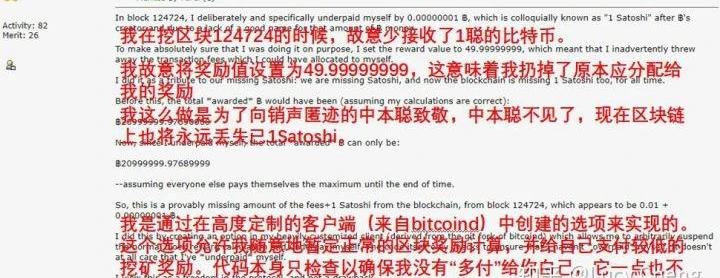 网友midnightmagic于2011年6月8日在Bitcointalk论坛上的回复这些矿工到底是有意的,还是因为挖矿软件出错而未能申领全额区块奖励我们无从得知;但midnightmagic一定是故意的。这位Bitcointalk用户2011年6月8日曾在论坛上发帖表示,为了向已消失匿迹的中本聪致敬,他在挖区块124724时,故意少接收了1satoshi的区块奖励;因为“中本聪不见了,现在比特币区块链上也将永远丢失1satoshi”。往期回顾:谁是最大的比特币持有者?下期预告:有多少比特币被「黑洞」吸走了?比特币你不知道的故事系列合集,将持续更新,敬请期待......
