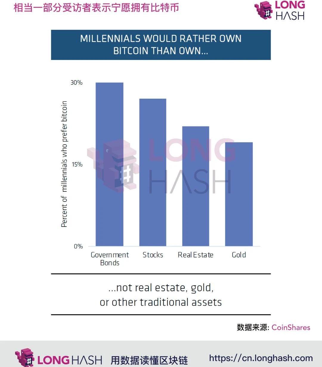 根据数字资产管理公司CoinShares最新一份报告的分析,他们认为预计在未来25年,将出现一次很大的财富转移,即婴儿潮以及婴儿潮之前一代人将把他们拥有的近68.4万亿美元,转移给X世代和千禧一代人,而这个数字比目前美国年GDP的三倍还要多。而似乎千禧一代的投资理念和之前几代人完全不一样,CoinShares强调了来自区块链Capital的一项调查,该调查显示,相当一部分受访者表示宁愿拥有比特币,也不愿持有政府债券,股票,房地产和黄金。