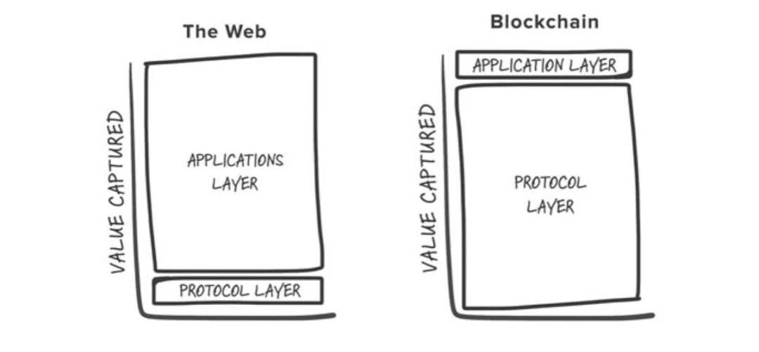 区块链应用堆栈(2014)我预测,随着加密技术接管网络,该架构将在十年之内成为全新在线服务的主流。因此,回顾这个想法过去五年的发展,是很有意思的。这一构想最明显的缺陷是,认为我们应该在比特币网络的基础上构建一切。现在我们有了多种区块链网络可供选择,情况大为改观。我们现在把「覆盖网络」称为第二层。时至今日,上述技术架构有了一个更好的名字:「Web3堆栈」。不过总体上来看,这种架构是成立的。两年前思考这个问题时,这个模型把我带到了当时技术界争论很热的概念:「胖协议」。我当时认为加密货币的大部分市场价值应该是在「协议层」捕捉,而网络层面的价值应在「应用层」捕捉。