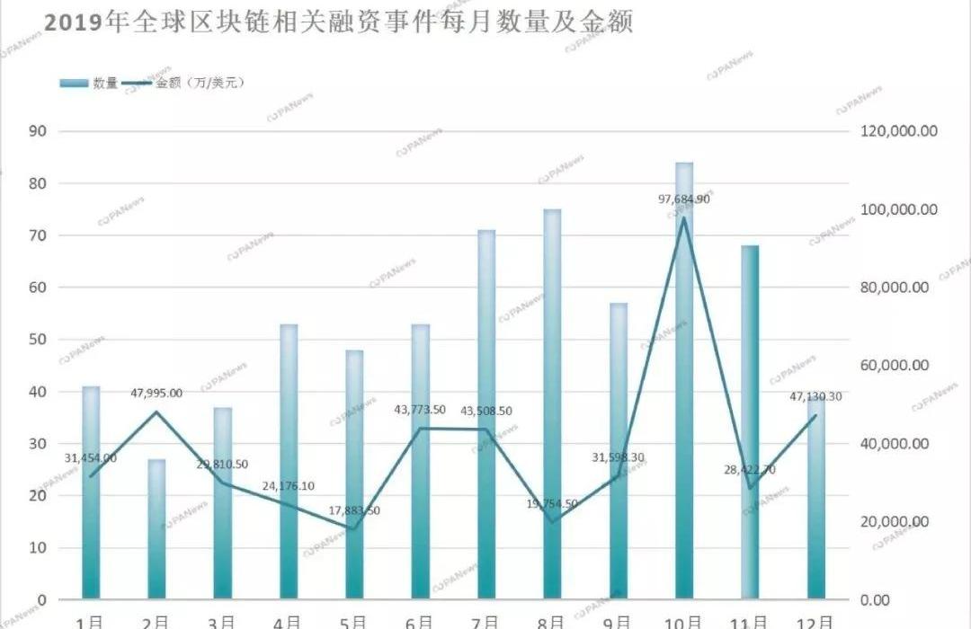 文|周文怡编辑|毕彤彤出品|PANewsPADataInsights:2019年区块链相关融资事件累计653起,投资市场总体回暖,下半年融资活动较上半年环比增长超50%。2019年区块链相关融资市场流入资金近47亿美元,月均融资资金达3.91亿美元,项目平均融资资金超过866万美元。战略投资及A轮以下融资是绝对主流。数字资产类项目最受投资者关注,交易所是该类别重点赛道,融资事件占到60%。中美两地在区块链相关投融密度和广度上远超其他国家,合计投融事件占据全球60%。2019年国内区块链相关投融资活动地区分布与国内区块链产业分布具有强相关性,产业聚集效应显著据PANews不完全统计,2019年全年,全球范围内区块链相关融资事件共有653起,融资总金额近47亿美元;此外2019年度公开并购事件达到35起,并购总金额超过30亿美元。需要指出的是,本次报告只统计了公开披露的融资信息,且并未统计IPO、IEO、ICO、STO等融资形式。本文数据来源:PANews、天眼查、IT桔子、Crunchbase等。1.全年区块链相关融资超47亿美元项目平均融资额约719.75万美元2019年全球区块链行业融资事件数量共计653起,融资频次总体呈波动上升趋势。其中,自2019年以来,2月至8月,区块链项目投资市场热度复苏,投融资数量阶梯式上升状态显著,7-8月融资活动显著拔高,两个月累计共146起。9月,投融资市场降温,融资事件数量骤降近20起,环比下降近25%。进入10月,全球区块链市场迎来了当年资本活跃的巅峰,当月融资事件有84起,接近全年融资事件的13%,但在2019年的4个季度中,第4季度投融资状况最不稳定,10月融资高峰并未维持多久,投融市场活跃热度在两个月内急转直下,至12月,仅有39起投融资事件,低于2019年融资动态的月平均值54.4起。此外,2019年下半年市场热度显著提升,下半年融资事件较上半年增长135起,环比上涨超50%。值得一提的是,2019年中,区块链投资市场的情绪与比特币市场行业以及各国政府监管政策息息相关。其中,融资事件较活跃的时期与当年比特币行情涨势相对吻合且稍有滞后;其中,7-8月间,大量资本入场,投资者对行业信心大增并持续影响到当年10月;此外,今年下半年全球范围内对加密领域的监管相继进入寒冬,尤其是备受瞩目的稳定币项目Libra接连受挫,此外,尽管各国对区块链相关技术持开放态度,但对加密货币相关业务却普遍持质疑和强监管态度,一时间,行业内以交易所为代表的最能成为短时间内流量变现最受追捧的“数字资产”相关领域接连遭遇重击,致使第四季度中资方活动更加理性和谨慎。