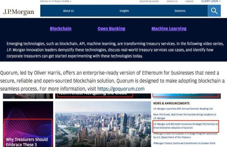2019年2月14日摩根大通高调宣布其成为第一家成功发行锚定法定货币的加密货币的美国银行。这一举动,代表了传统金融强权正式开始构建新的金融秩序。从摩根大通的首页可以看出它非常重视科技在金融发挥的作用,尤其是区块链技术。