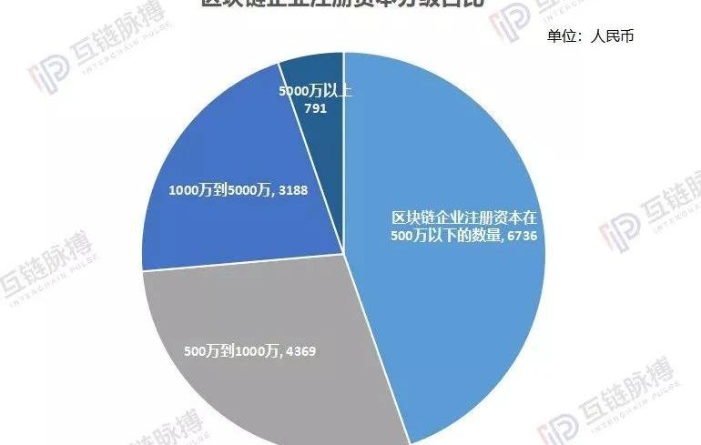 而信息传输、软件和信息技术服务业领域位列第二,共有3028家;租赁和商务服务业有1648家;科学研究和技术服务业有388家。位列第五的领域是金融业,但归属该领域的区块链企业数量不及意料中多,有181家。其中有73家为融资租赁公司,有22家为投资公司,19家为保理公司。虽然,2019年成立的区块链公司广泛分布于10多个行业领域。但互链脉搏,综合区块链企业的注册资本和企业的参保人数来看,目前成立的区块链公司仍多为中小型企业。互链脉搏根据企查查数据检索,2019年区块链企业注册资本在500万元以下的有6736家,占2019年成立区块链企业总量的44.65%;注册资本在500到1000万元之间的有4369家,占总量的28.96%。也就是注册资本低于1000万元的企业有7成之多。