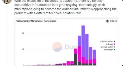 在3月6日,他关注Blur与Opensea冲突的阴影下,Ordinals对市场的扩张,随着ordinals流行度的爆炸式增长,激烈的基础设施争夺正在进行。其中OrdinalsMarket以现有的以太坊基础设施,使用EmblemVault开发的技术促进以太坊区块链上的比特币铭文交易,以规避比特币网络速度慢和体验差的问题,其他方则采用新颖的比特币原生解决方案。