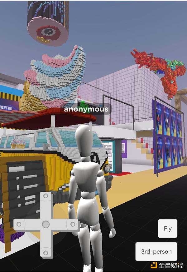 Cryptovoxels(简称CV)类似于开放游戏“我的世界”,这个由一个个小像素块构成的游戏中,玩家没有目标,没有任务,更没有游戏设定的NPC,有的只是一块块地皮,购买属于你的CV地皮,这块地方可以有无限可能。微博数字美术馆正是基于CV的虚拟艺术展览,一进入这块地皮就可以看到巨大的微博数字美术馆的海报还有高悬在头顶的新浪微博的LOGO,天空还有一只飞翔着的巨大的鸟,这是属于艺术家的一件别致展品。
