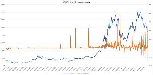 那么稳定币的增长和加密市场价格有没有什么互为影响的内在联系呢?从历史上看,加密资产市场巨大的价格波动往往会催生稳定币的增发。这一点在链上数据上也有体现,在价格发生波动的时候,稳定币的链上活动(铸币或销毁)也比较活跃。