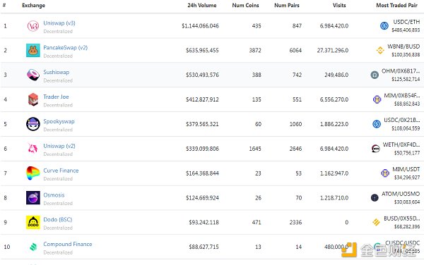 过去24小时去中心化交易所的交易量 数据来源:Coingecko