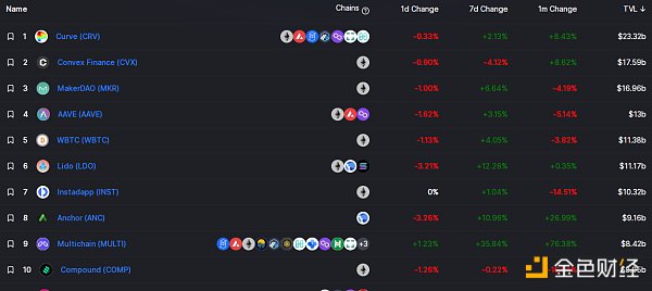 DeFi项目锁定资产前十排名及锁仓量 数据来源:defillama