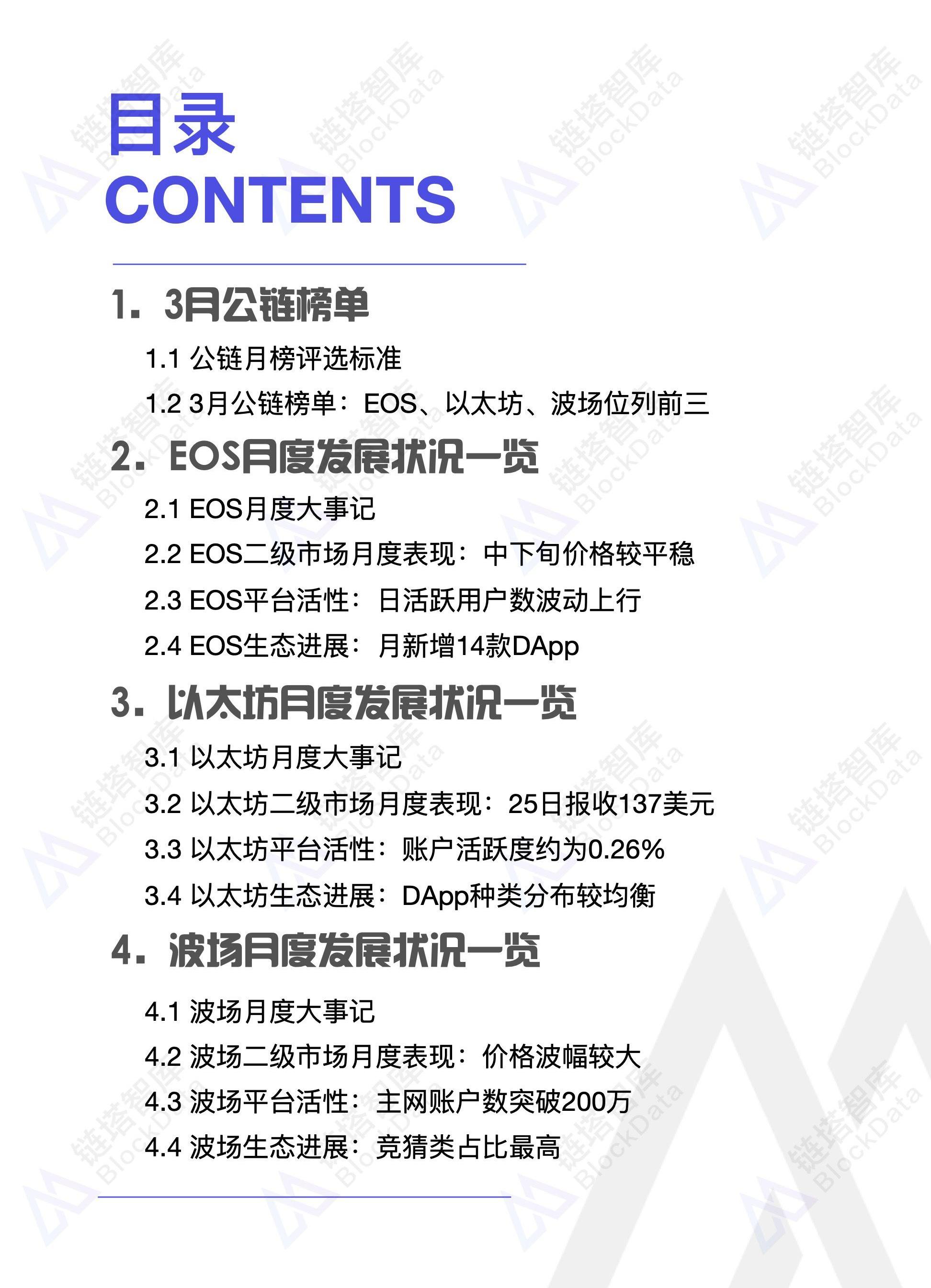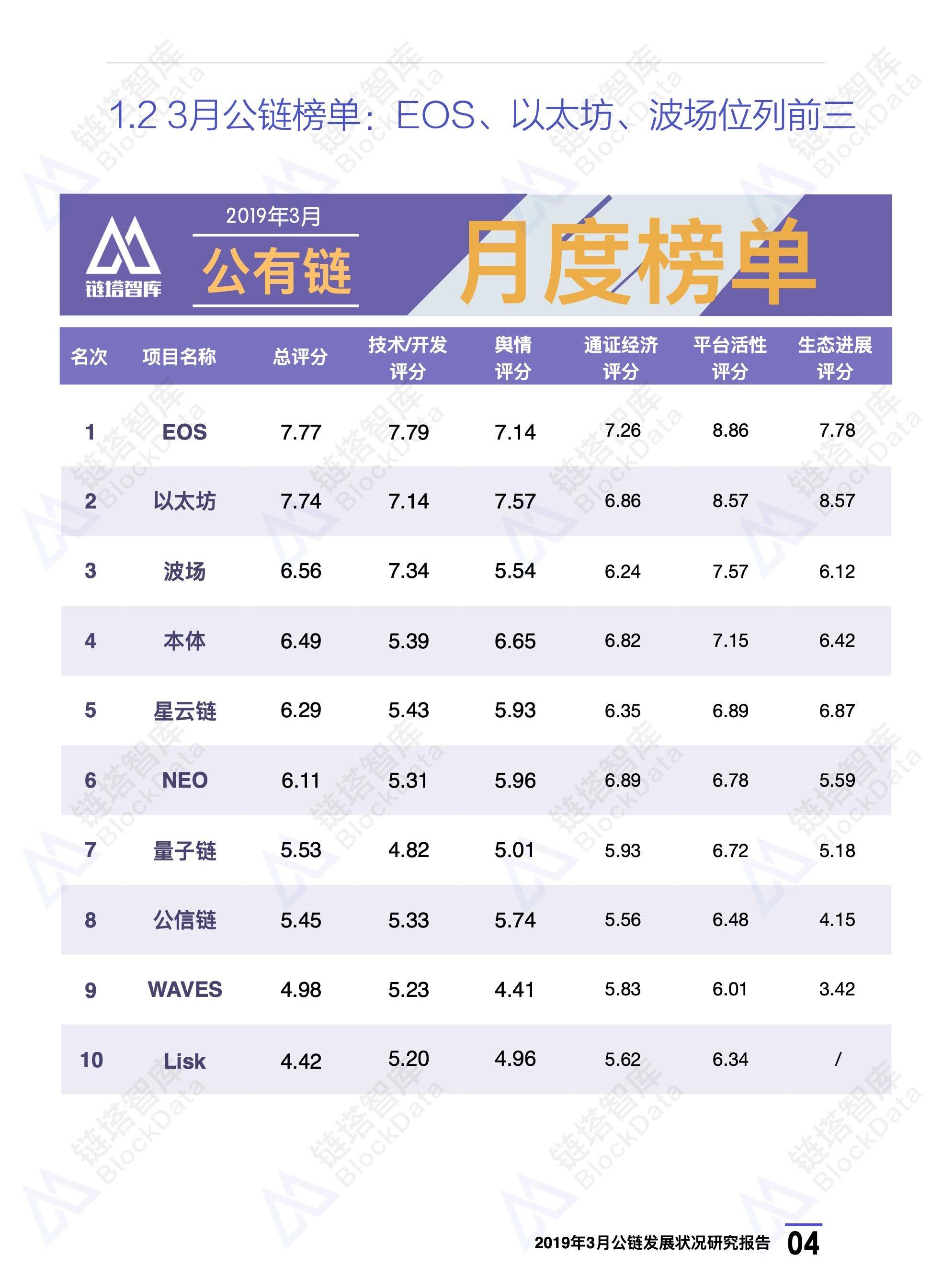 前言公链是指任何人都可以读取、发送交易且交易能获得有效确认的、也可以参与其中共识过程的区块链。公有链之于区块链世界,相当于Windows之于电脑,即公有链是区块链世界中的操作系统,是区块链世界的基础设施。公链作为区块链世界里的基础设施,主要用来拓展性能或为商业应用提供服务支撑,只有在公链扎实稳健高效运转的基础上,区块链商业应用才能真正地落地和发展。为深入了解公链生态的发展情况,链塔智库推出公链月度榜单,从公链技术/开发情况、公链舆情、通证经济稳定性、平台活性、生态进展五个维度对公链进行评价,旨在发掘公链价值,宣传优质项目。根据3月份公链月榜评选结果,EOS、以太坊、波场总评分位列榜单前三。链塔智库分析师团队对EOS、以太坊、波场的月度发展状况进行了研究梳理,形成完整报告。