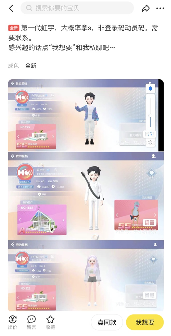 在周一兰接触的众多玩家中,初级玩家的心态普遍是,虽然虹宇宙内测体验槽点满满,但能赚一点是一点。而高峰时期,在交流群内,有人会发出房产每日交易的开盘、收盘价格,闲鱼上也有专门的虚拟房源交易中介人员,彼时这些房源的价格一天高过一天。