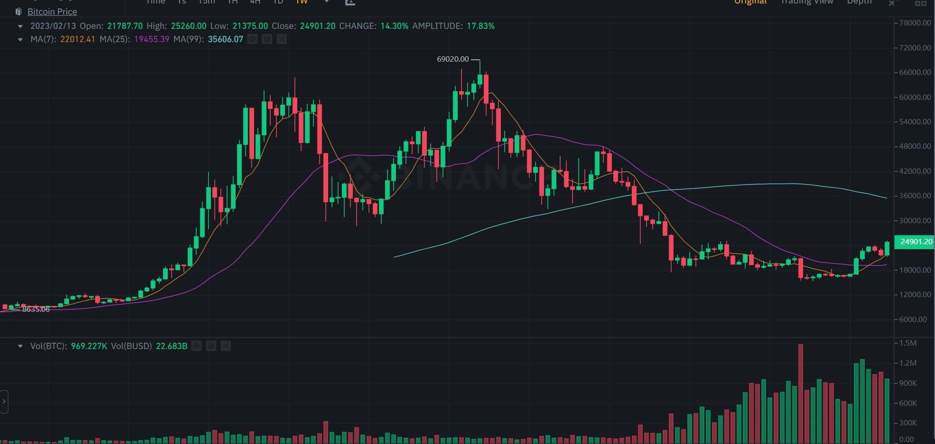 上周加密市场表现出了极强的韧性与弹性,周一至周三在美股上涨的阶段比特币上涨12%,周五开始跟随美股回调,但国内时间周六顶住了美股继续回调的压力完成反弹,并在周末继续小幅上涨,周线也完成了强势突破,交易所交易量继续上升来到了33BillionUSD,截至撰稿比特币收于24901.2,周内上涨13.47%,振幅17.83%;以太坊收于1696.07,周内上涨12.08%振幅18.55%。