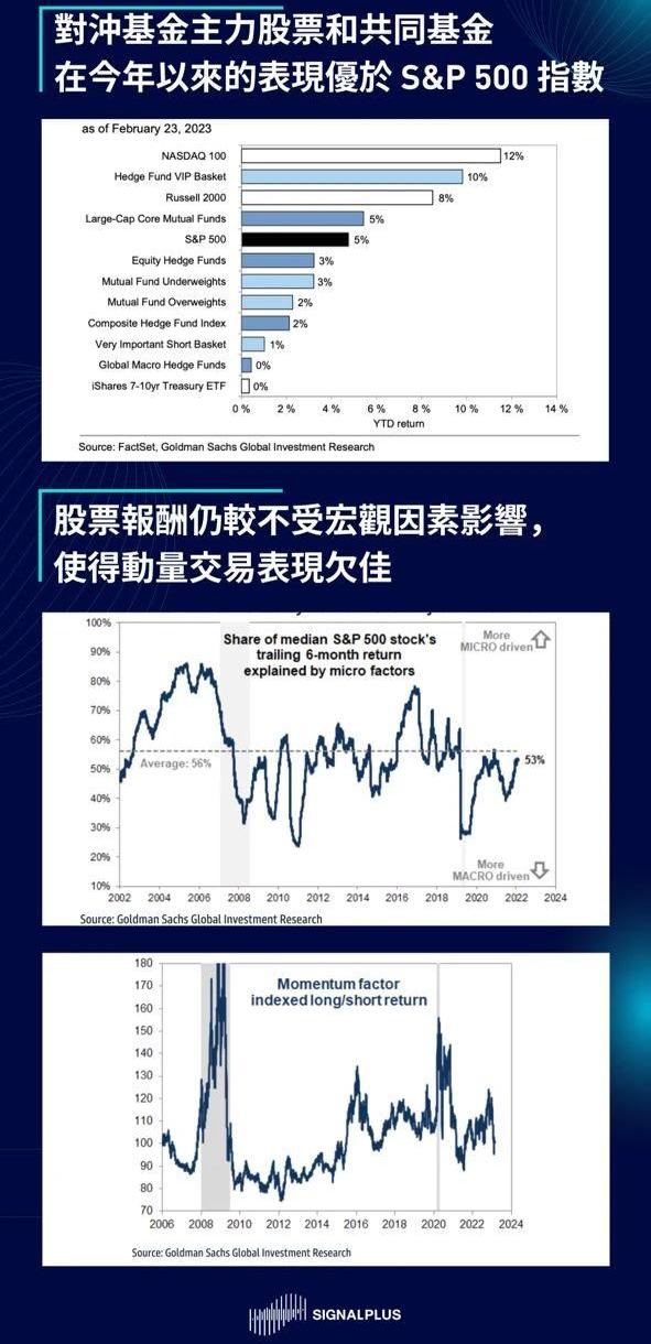 在股票方面,上周股市经历了今年以来最糟糕的一周,因为股票投资者通常对宏观变化的调整较为缓慢,对冲基金和共同基金才刚刚重新增加了股票总敞口,尽管如此,对冲基金重视的股票和大型共同基金在今年为止的表现仍优于S&P500指数,而随着股票报酬的变异增加,动量交易策略在今年的表现则没有起色。