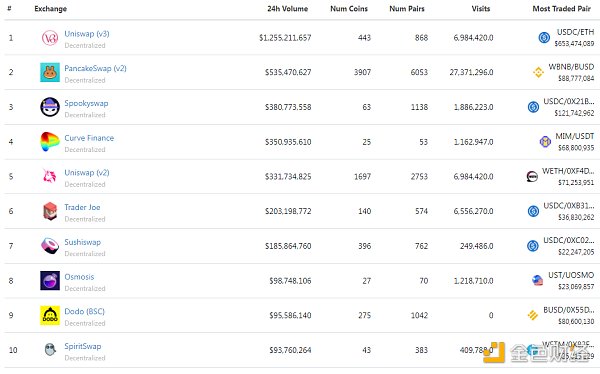 过去24小时去中心化交易所的交易量 数据来源:Coingecko