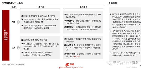 NFT铸造及发行的类型主要可分为PGC及UGC。PGC的主要盈利模式为销售分成及赚取差价。UGC的盈利模式以手续费为主,其次是GAS费的差价。