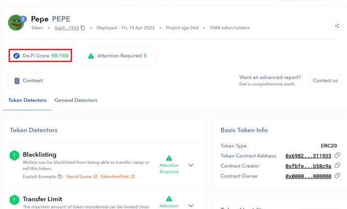 从上图中,我们可以看到$PEPE的合约没有潜在的RUG风险以及其它常见的智能合约漏洞风险。