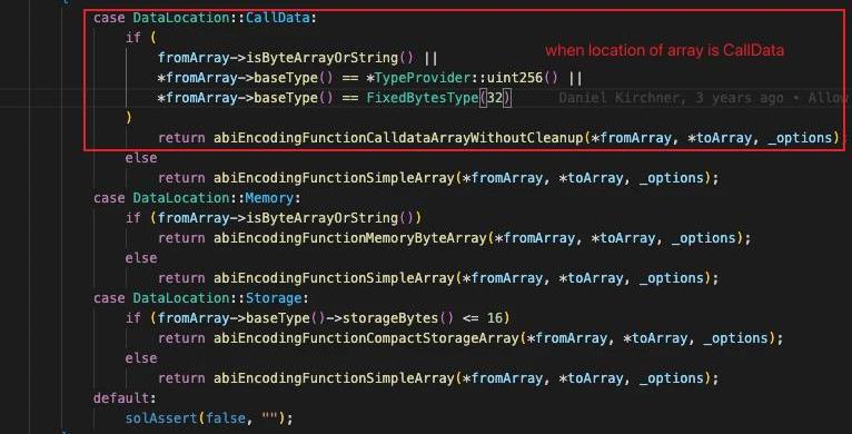 当源数据存储位置为Calldata,且源数据类型为ByteArray,String,或者源数组基础类型为uint或bytes32时进入ABIFunctions::abiEncodingFunctionCalldataArrayWithoutCleanup()