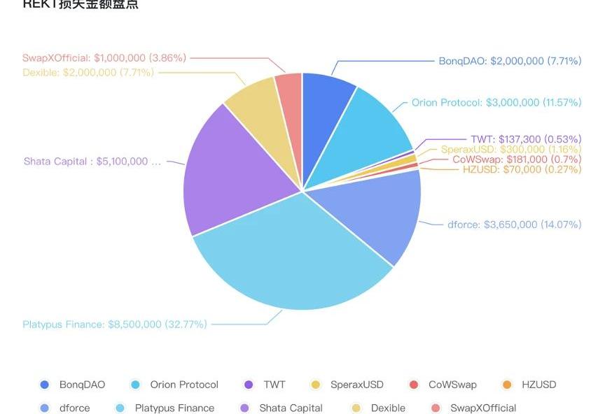 2023年2月安全事件共造成约3796万美元损失,相较于上个月,安全事件数量与损失金额都有显著上升,其中PlatypusFinance闪电贷攻击为单次利用损失之最高达850万美元。本月RugPull数量基本与上月持平,损失金额占比显著降低,但社媒等事件依然高发,Twitter项目方账户伪造与官方Discord被攻击发布钓鱼链接层出不穷。