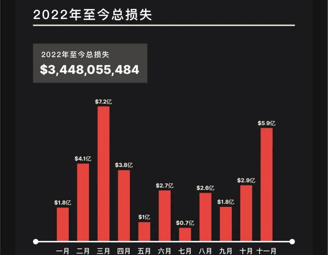 损失金额较高的主要原因是FTX交易所的黑客攻击造成了4.77亿美元的损失,而仅这一事件就占据了本月总资金损失的79%。如果没有该事件,11月的总损失金额则为1.195亿美元,位列今年11个月的倒数第三。