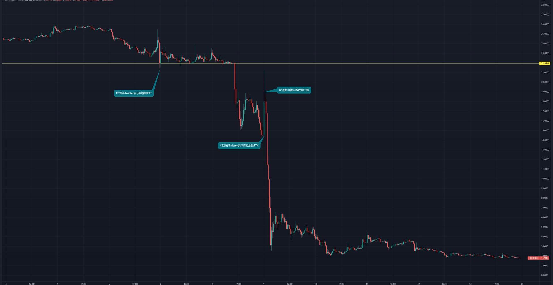 11月9日凌晨,CZ发推表示收到了FTX的求助,并签署了不具约束力的收购意向书,拟完全收购FTX。消息一出,FTT瞬间暴涨至21美元附近,但随即受反垄断可能终止交易的消息影响,市场继续暴跌。由于CZ公开了SBF的求助消息,FTT一路向下暴跌至3美元附近。