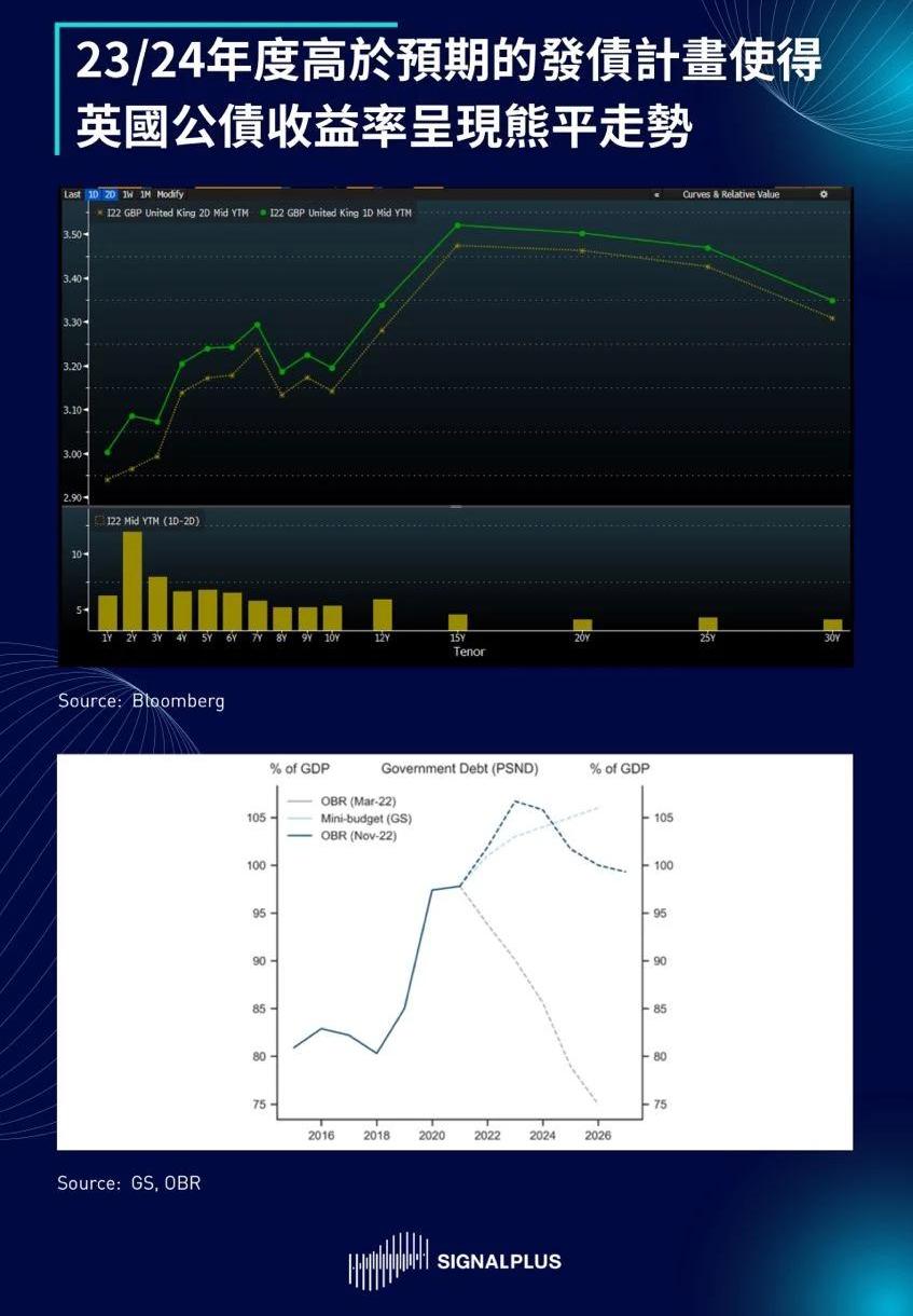 昨天美国公布一连串整体低于预期的经济数据(10月新屋开工-4.2%,10月营建许可-2.4%,费城联储制造业指数落至-19.4vs预期的-6.4),但市场走势主要还是受到英美两国政策面和供给面消息影响。英国宣布规模为550亿英镑的财政计划,预计减支300亿英镑并增税250亿英镑,这是英国自9月迷你预算案以来再一次的政策大转弯,不过23/24年度的发债计划也比市场预期的高出500亿英镑,使得英国公债收益率最终呈现熊平走势。