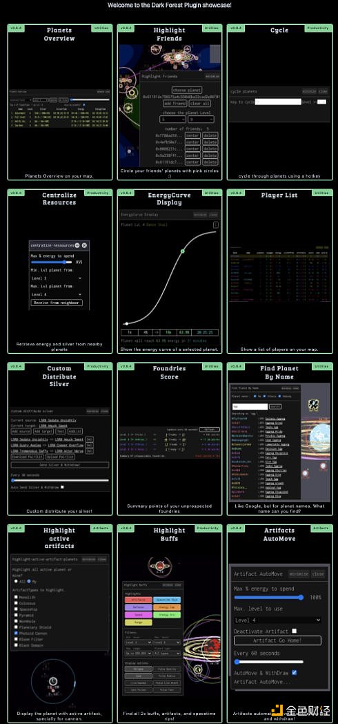 黑暗森林的用户插件照亮了游戏中最激动人心的部分。玩家创造了一切,从游戏内 NFT 的市场到自动安排移动的插件,再到加快玩家散列地图未知部分的速度的「远程 snarker」。